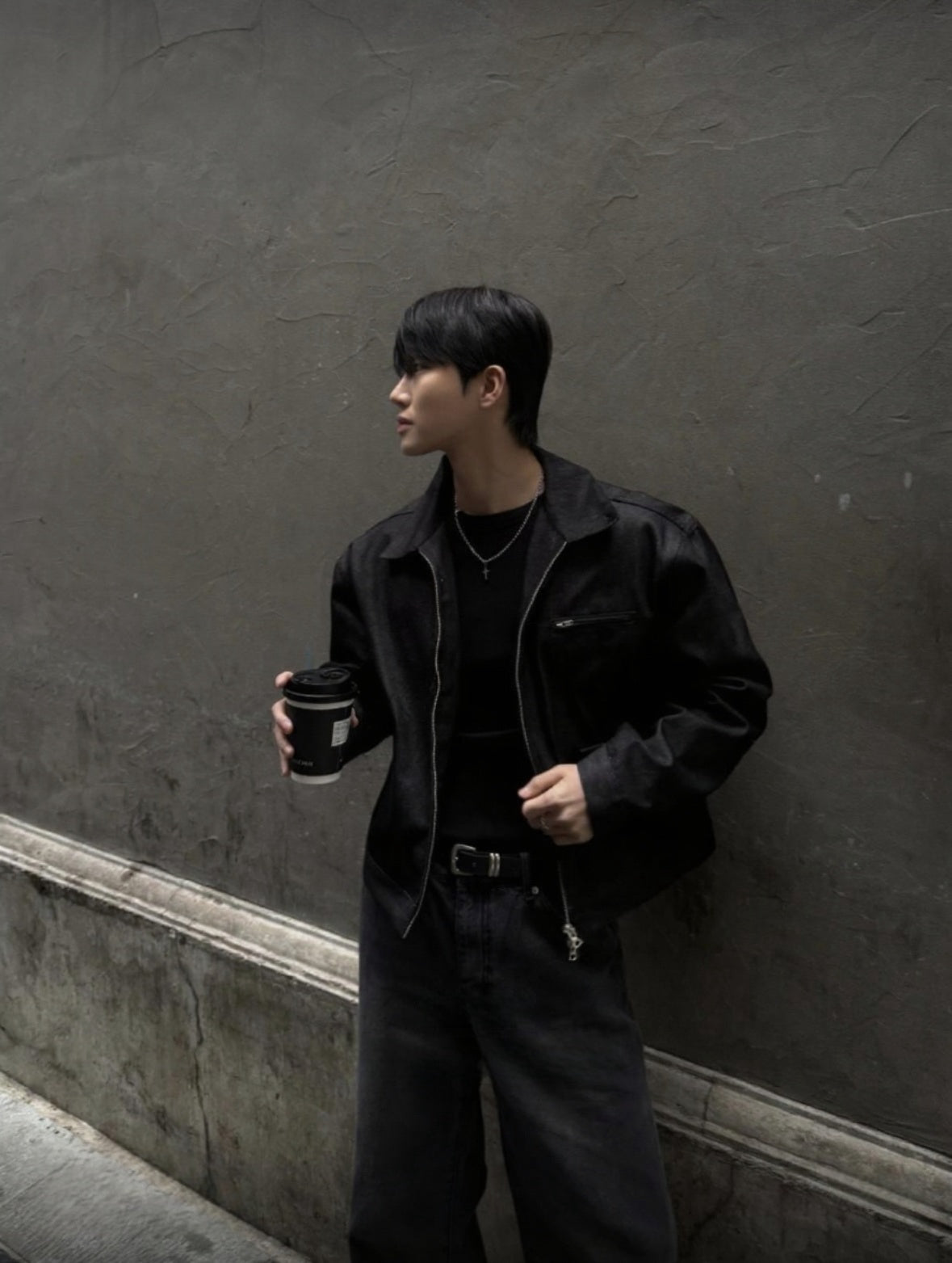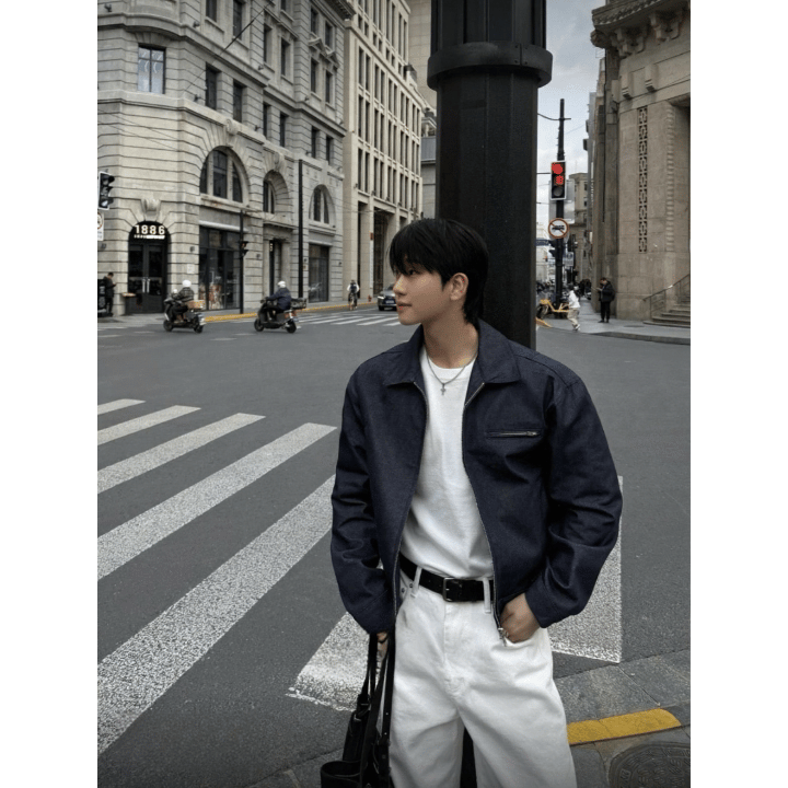 挺版短版剪裁,結合沉穩的深藍牛仔布料,襯出俐落且不費力的穿搭品味。胸口的斜拉鍊設計增添低調機能感,雙向拉鍊細節實用又有層次。單穿或搭配素色內搭都能展現韓系街頭感,秋冬過渡必備。