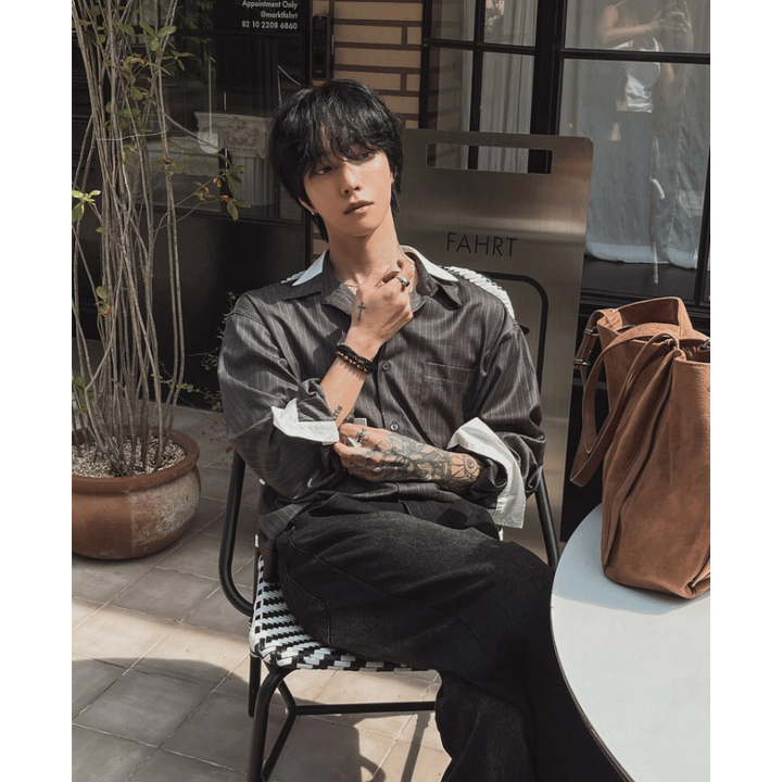 B140 撞色條紋拼接寬版襯衫 (灰 黑)