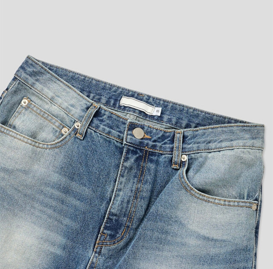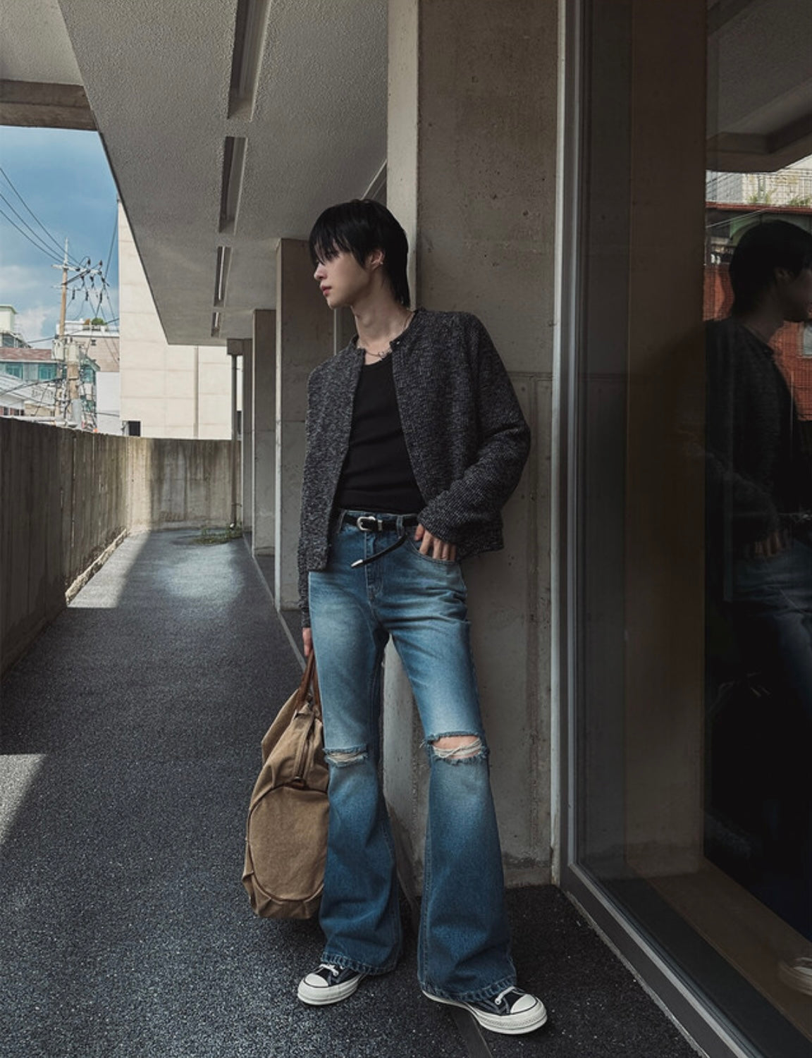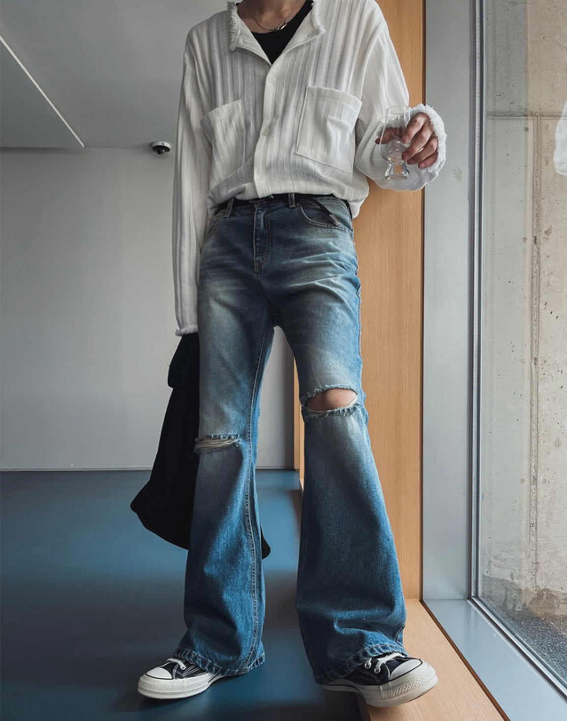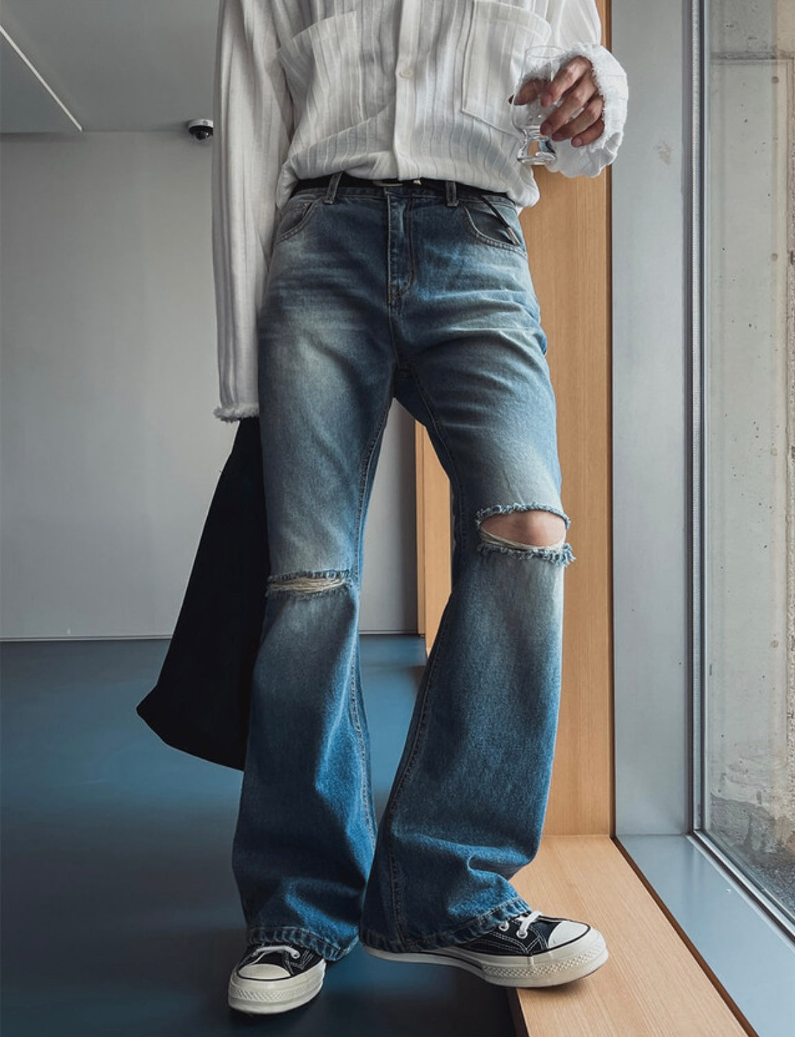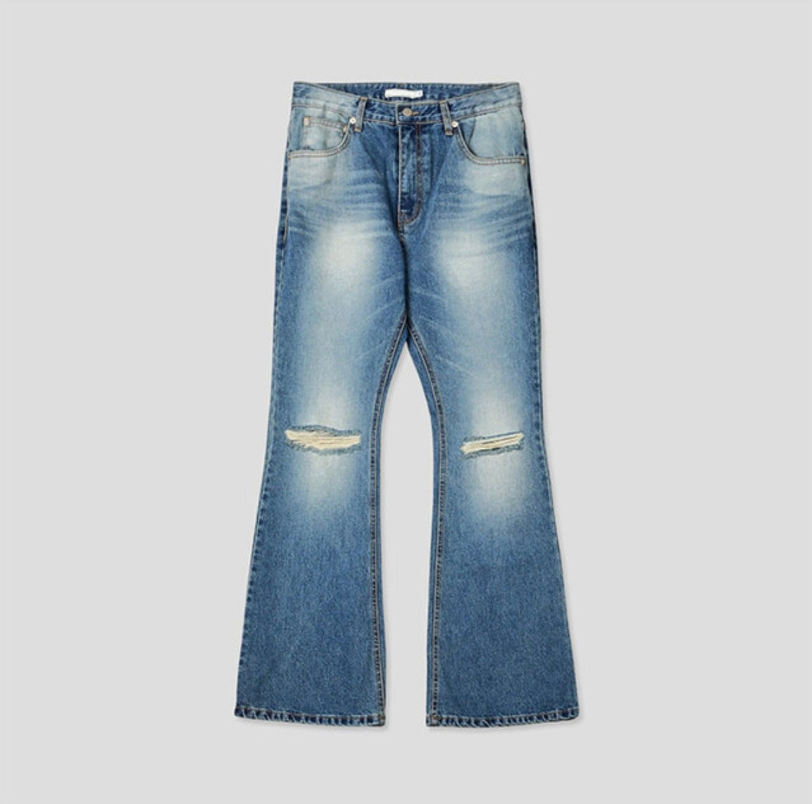 Crafted from a natural-looking mid-blue denim, these jeans feature a flared detail that hits just below the knee, creating a rebellious, modern look. The slightly flared hem flatters the leg, elongating the wearer's proportions and creating a sense of fluidity. The overall silhouette is retro yet effortless, perfect for pairing with a fitted vest or cropped jacket for a stylish and effortless look.