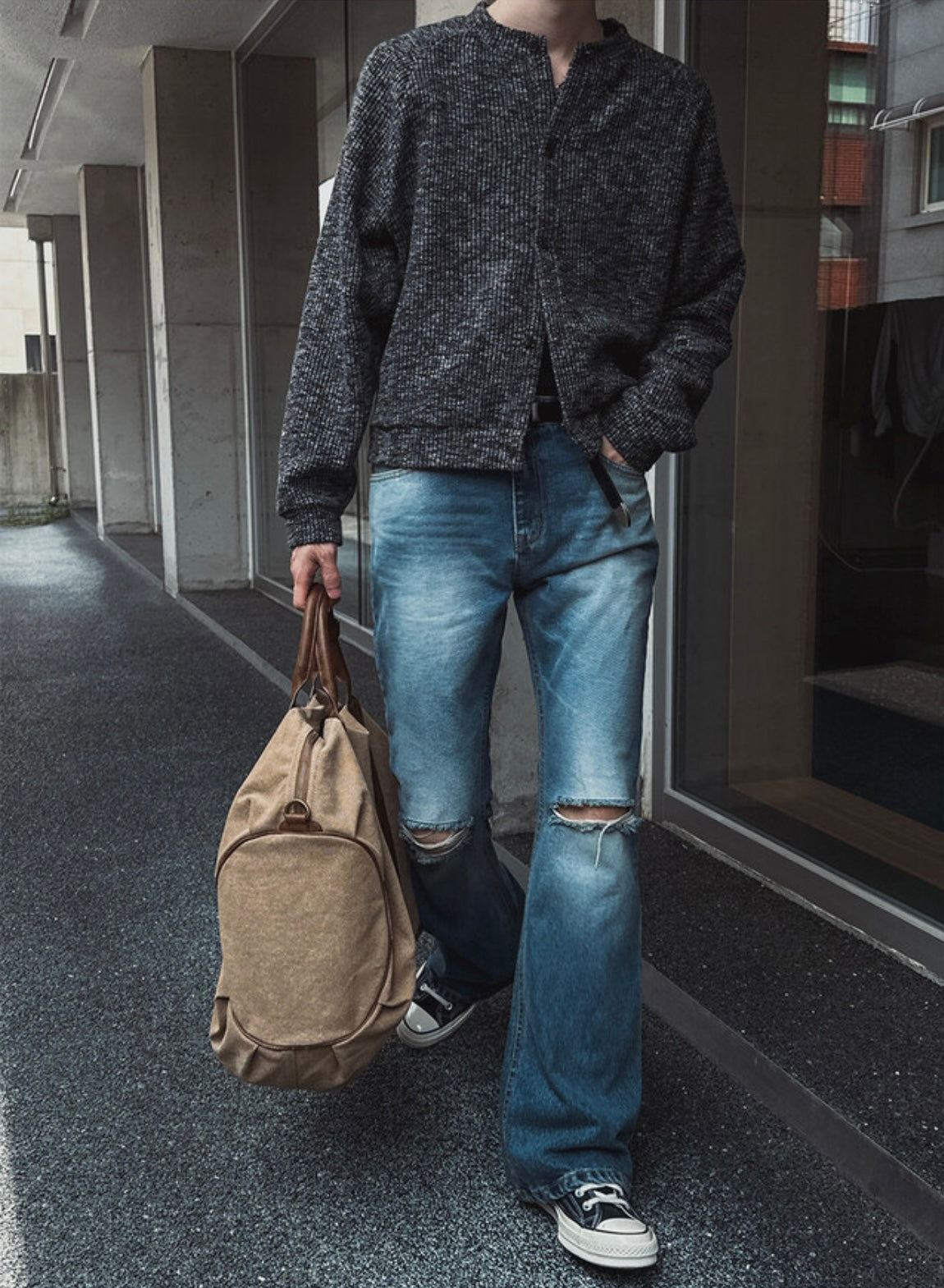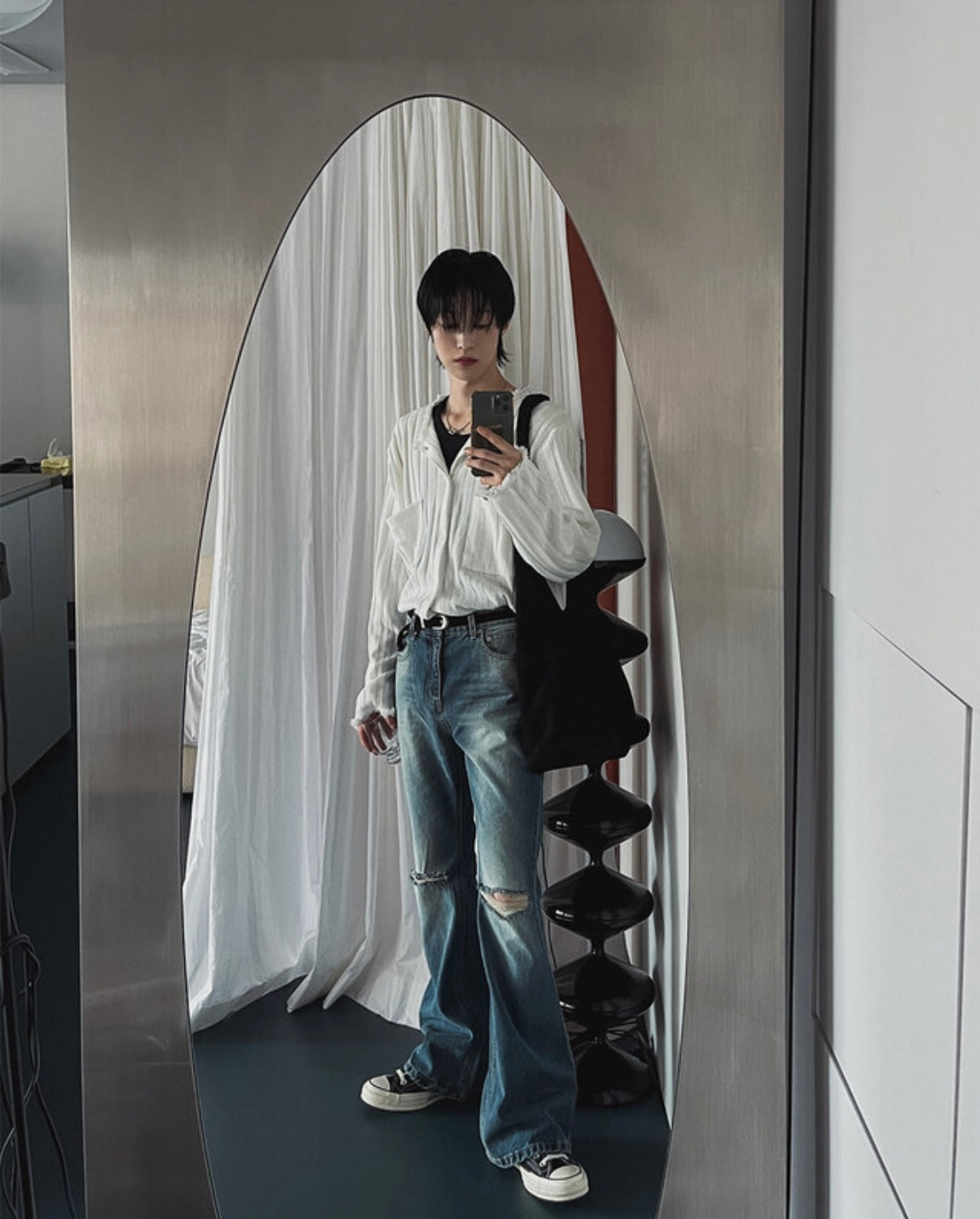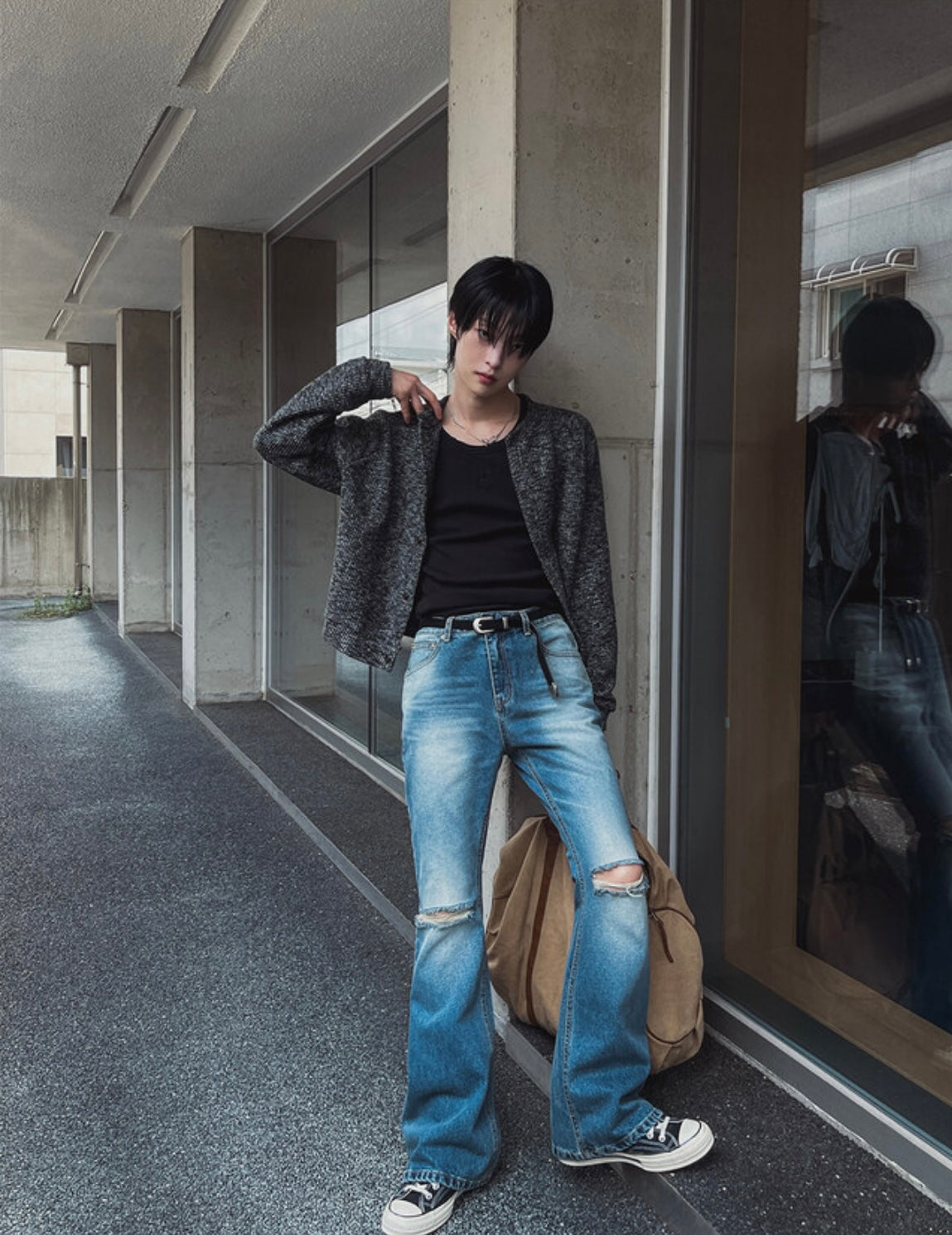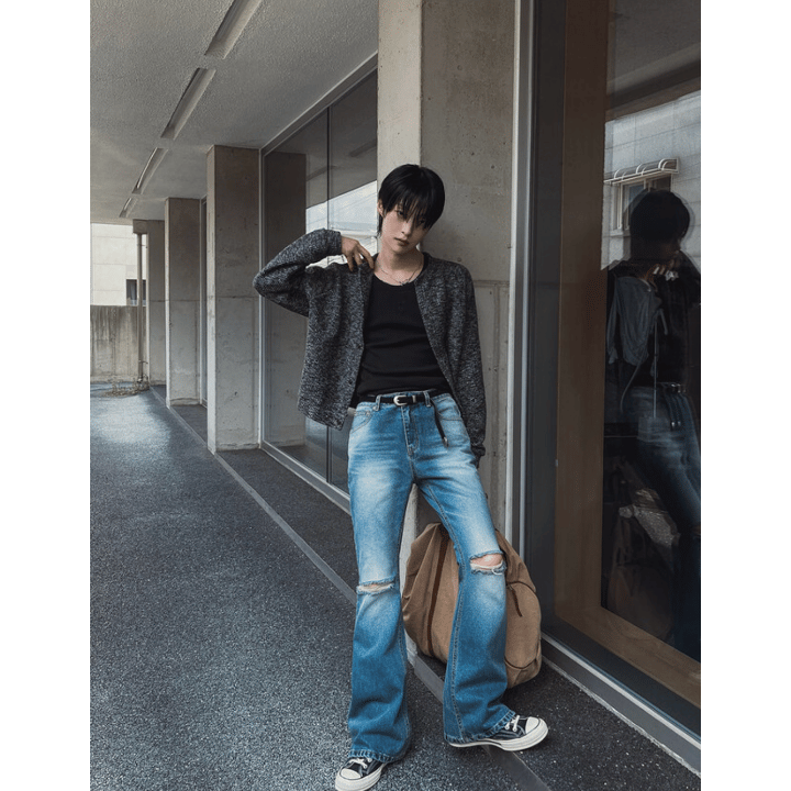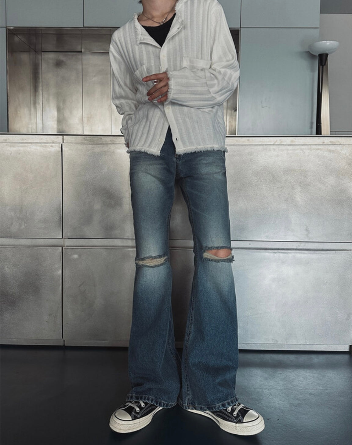 Crafted from a natural-looking mid-blue denim, these jeans feature a flared detail that hits just below the knee, creating a rebellious, modern look. The slightly flared hem flatters the leg, elongating the wearer's proportions and creating a sense of fluidity. The overall silhouette is retro yet effortless, perfect for pairing with a fitted vest or cropped jacket for a stylish and effortless look.
