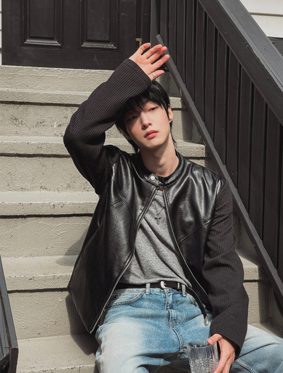 這款皮外套採用拼接設計,主體為光澤感皮革,搭配羅紋針織袖,柔中帶剛,視覺有層次卻不浮誇。無領剪裁讓整體線條更俐落,無論是搭配T恤還是針織上衣,都能自然融入日常穿搭。米白款清爽柔和,黑款則帶有一點叛逆與冷感,適合喜歡極簡又帶點個性風格的你。