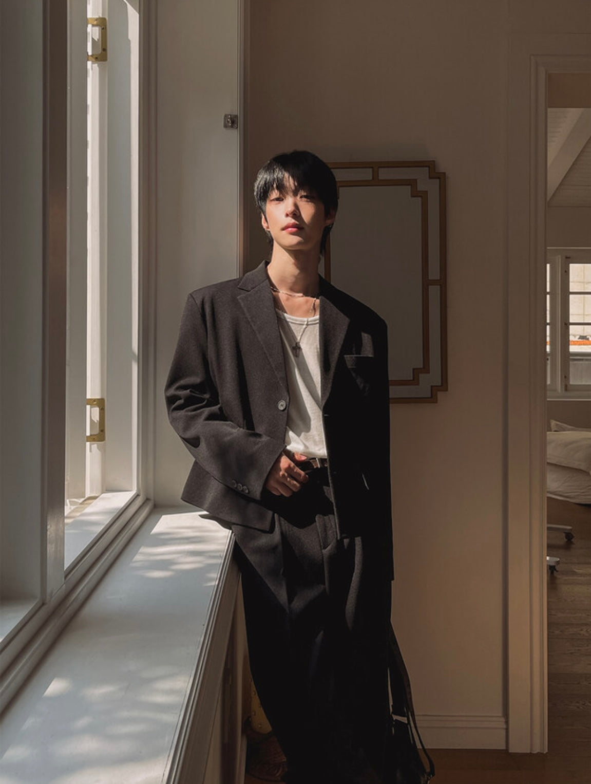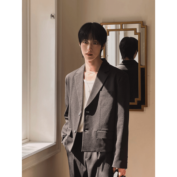 比例俐落不拘謹,霧面挺料不易皺,撐出乾淨線條,微厚度四季可疊穿,口袋細節低調卻實用,袖口開衩與內裡順滑,穿脫利落,可單穿配牛仔也能與同料寬褲成套,從通勤到約會都穩重有型,黑、灰兩色日常耐看。