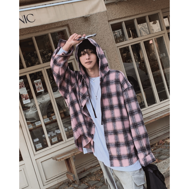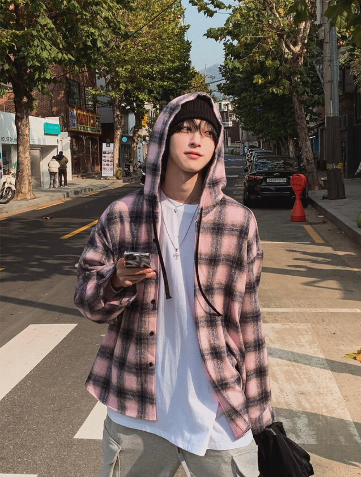 A109 溫柔感格紋連帽襯衫外套 (粉 藍)