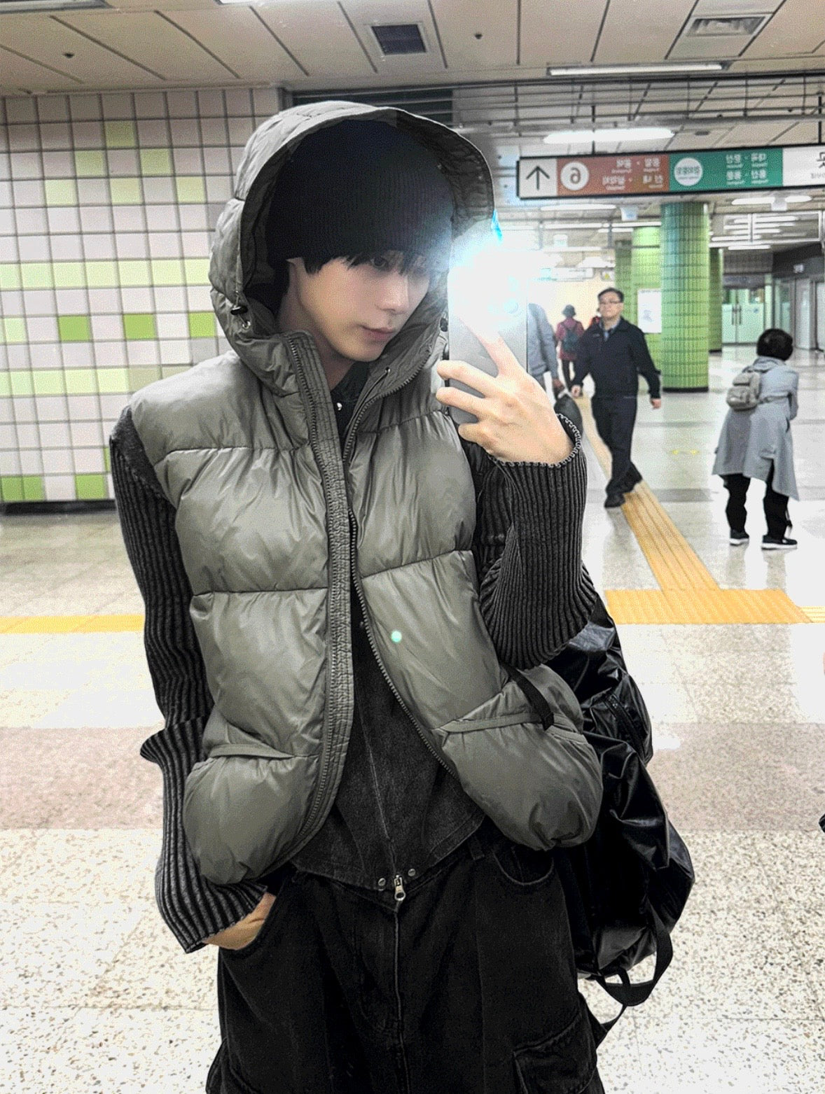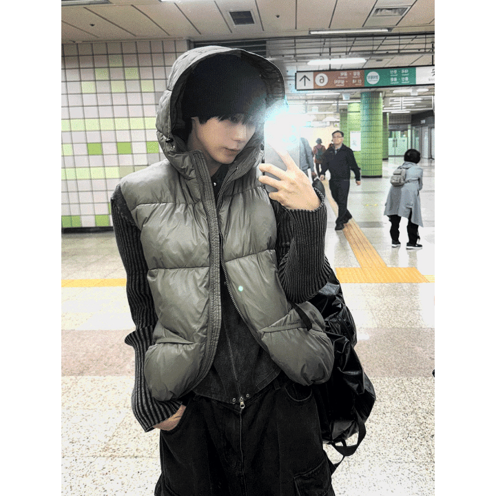 A141 金屬感連帽鋪棉背心 (卡其 黑)