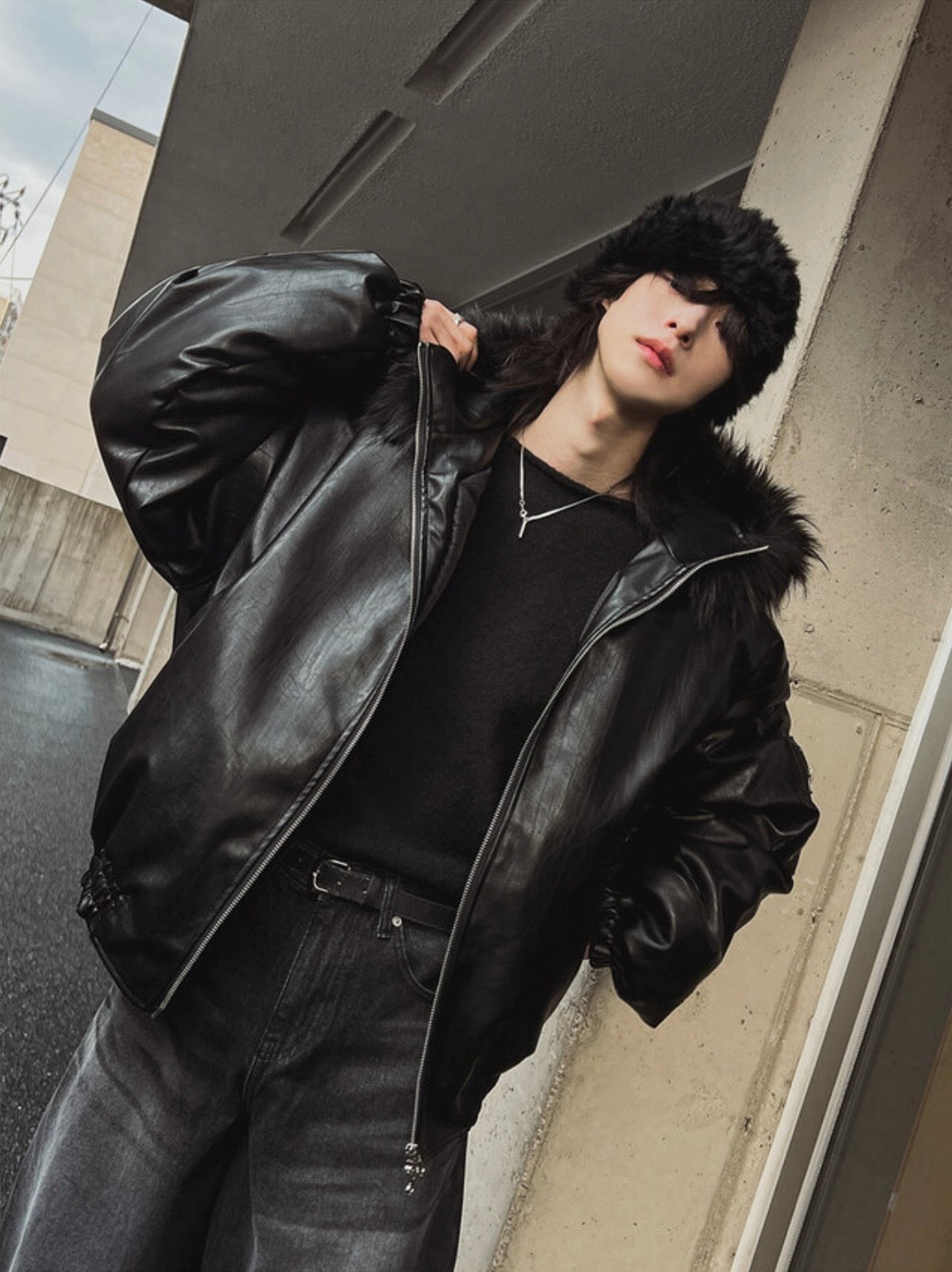 皮感霧面外層,挺度夠不僵硬,整體輪廓立體有份量,寬鬆剪裁搭配下擺與袖口鬆緊收口,穿起來俐落不臃腫,大毛領連帽設計提升保暖與層次,內搭厚衣也順暢,金屬拉鍊與手臂拉鍊口袋增加機能細節,日常防風與造型兼顧。