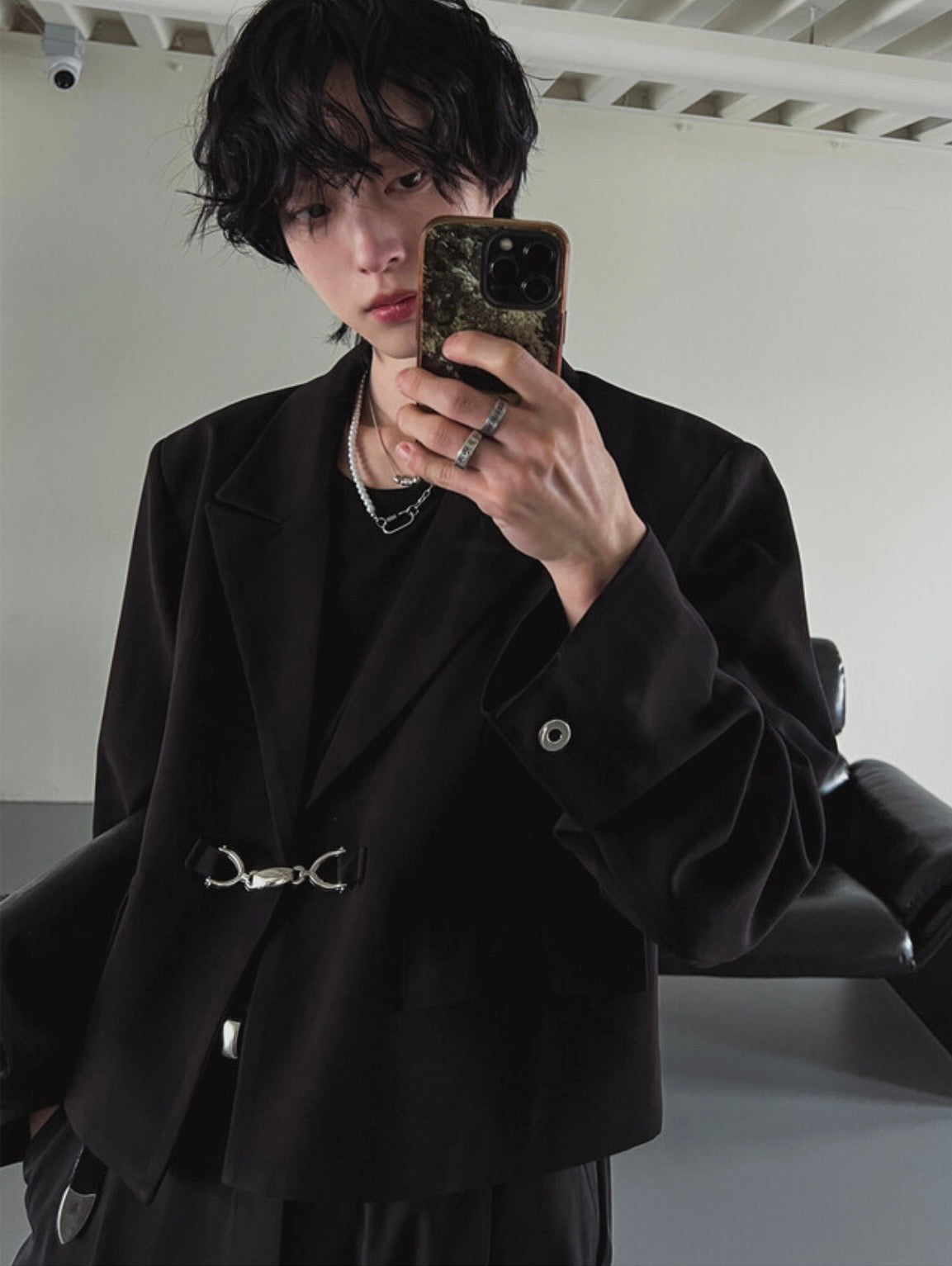 短版西裝外套+金屬扣的俐落款,硬挺有型但不厚重,肩線帶一點挺度,上身立刻有比例,短版落在腰上方,搭高腰褲腿直接拉長,正面馬銜扣五金是亮點,不用打領帶也有精緻度,翻蓋口袋與袖口孔眼細節,單穿就很完整,日常黑T、襯衫到內搭高領都好配,帥感不費力。