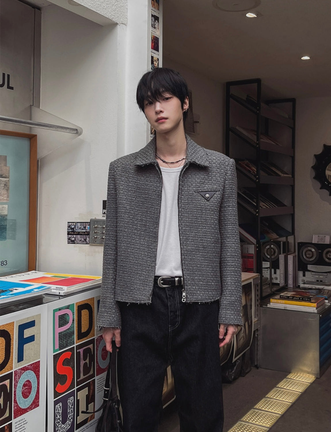 採用帶有立體紋理的粗花呢面料,手感紮實卻不厚重,版型挺拔,短版剪裁讓整體比例俐落,胸前搭配單邊金屬飾釦,為低調灰調增添設計細節,拉鍊開合、袖口小釦、下擺自然毛邊處理,皆是刻意留白的時髦,可正式、可日常,單穿就有質感存在。