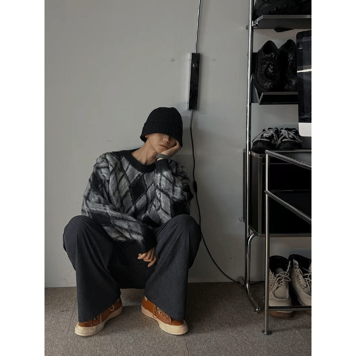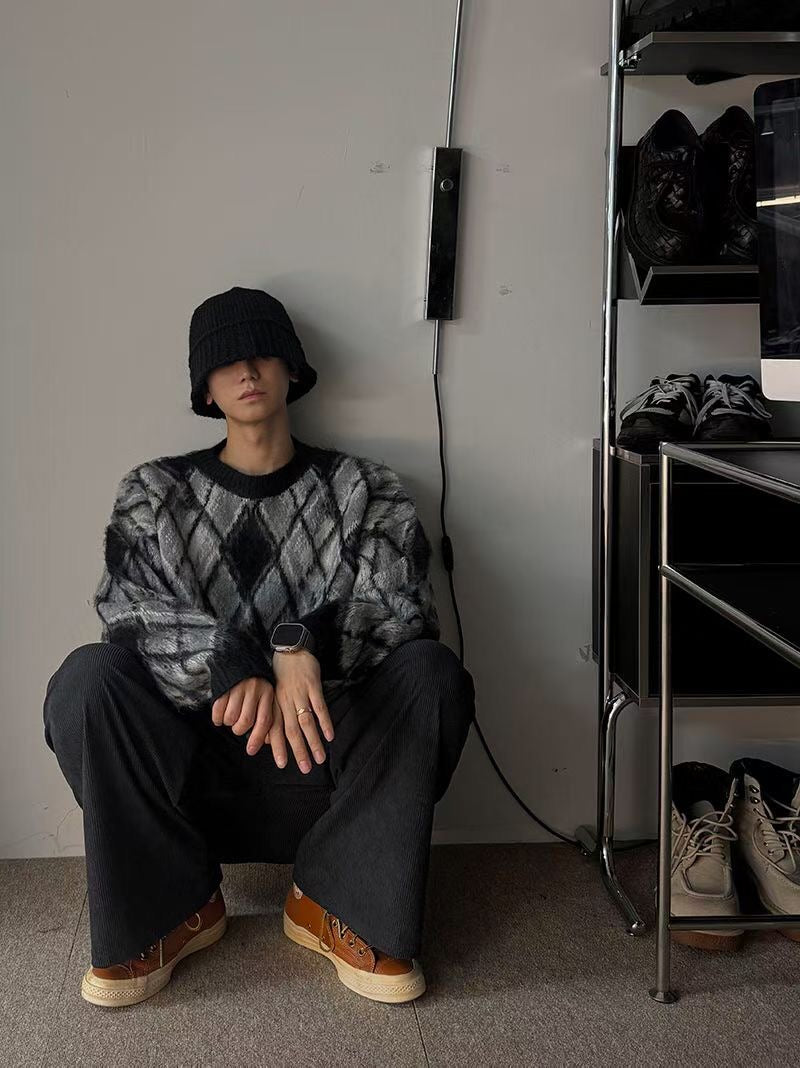 B138 高磅數菱格混色毛衣 (黑 紅)