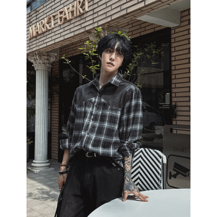 B143 美拉德皮革格紋襯衫 (黑 咖)