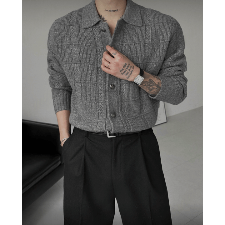B172 立體格紋羊毛開衫 (灰 黑)