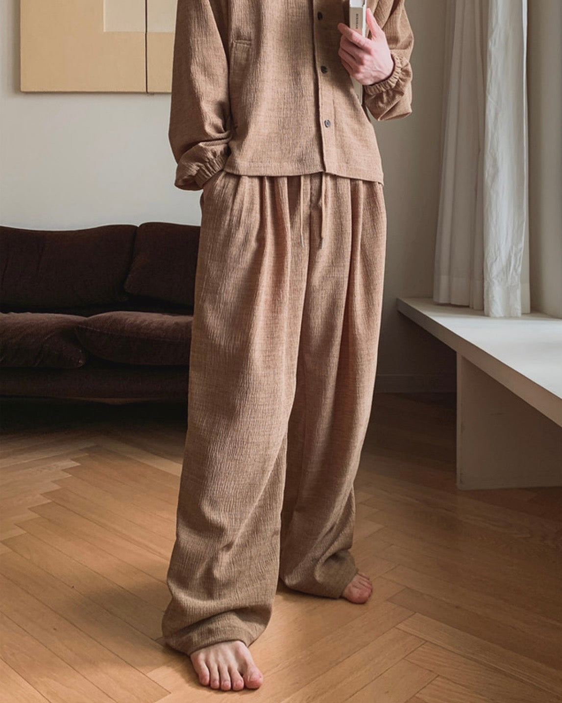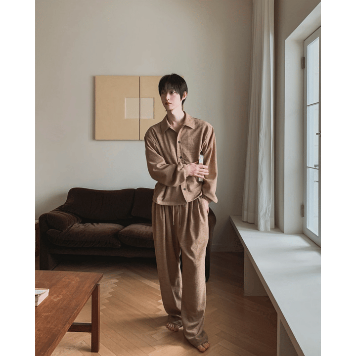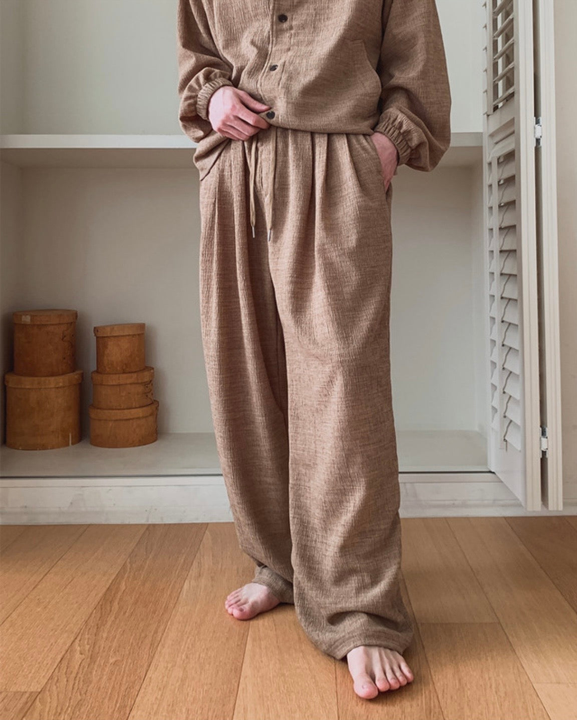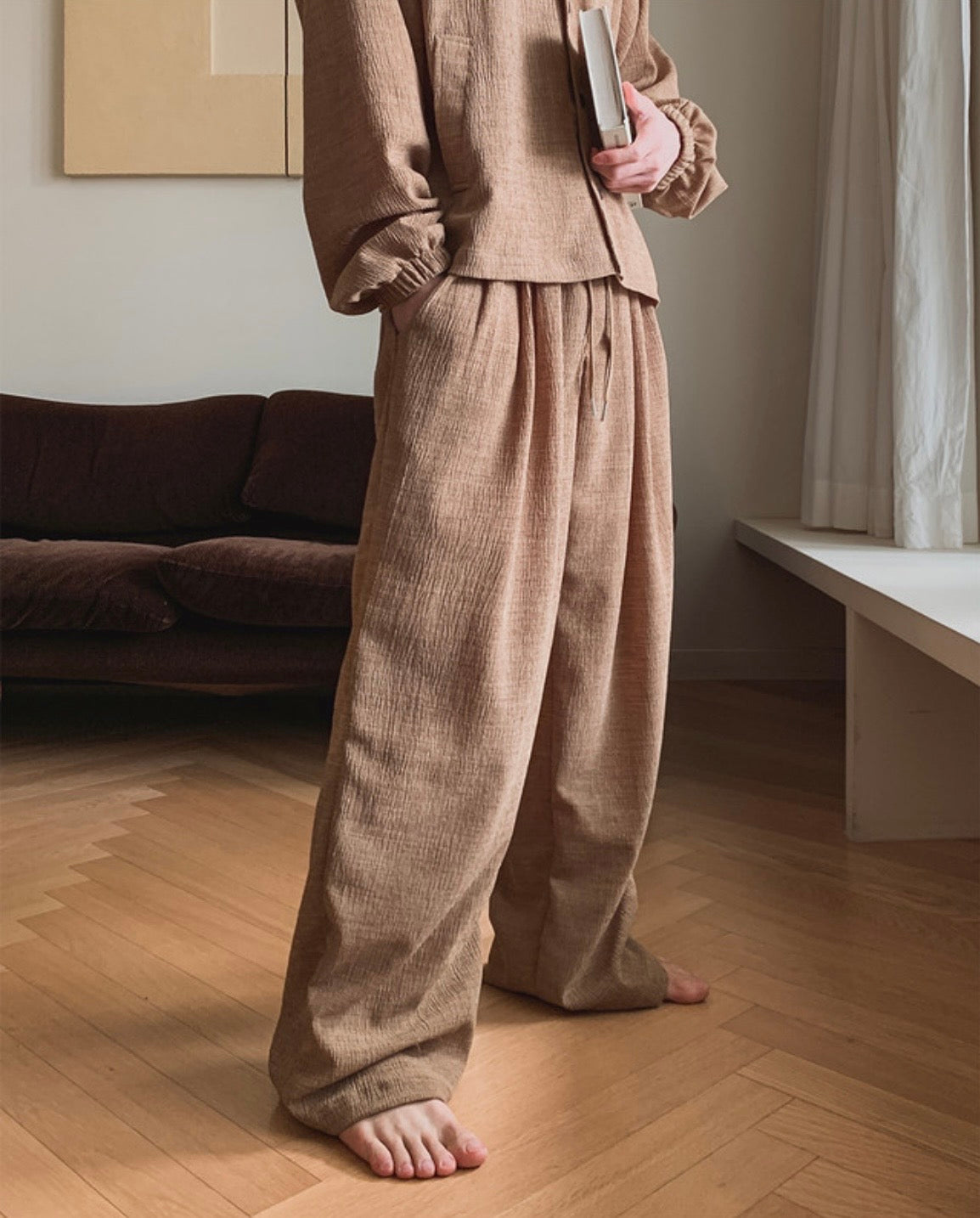自然紋理面料,帶點立體肌理感,不貼身卻很有型,寬鬆版型搭配打摺設計,穿起來垂墜順,比例拉長,日常或居家都很舒服,腰頭鬆緊+抽繩設計,包容度高,不挑身形,是那種看起來很隨性但其實很有質感的一條褲子。