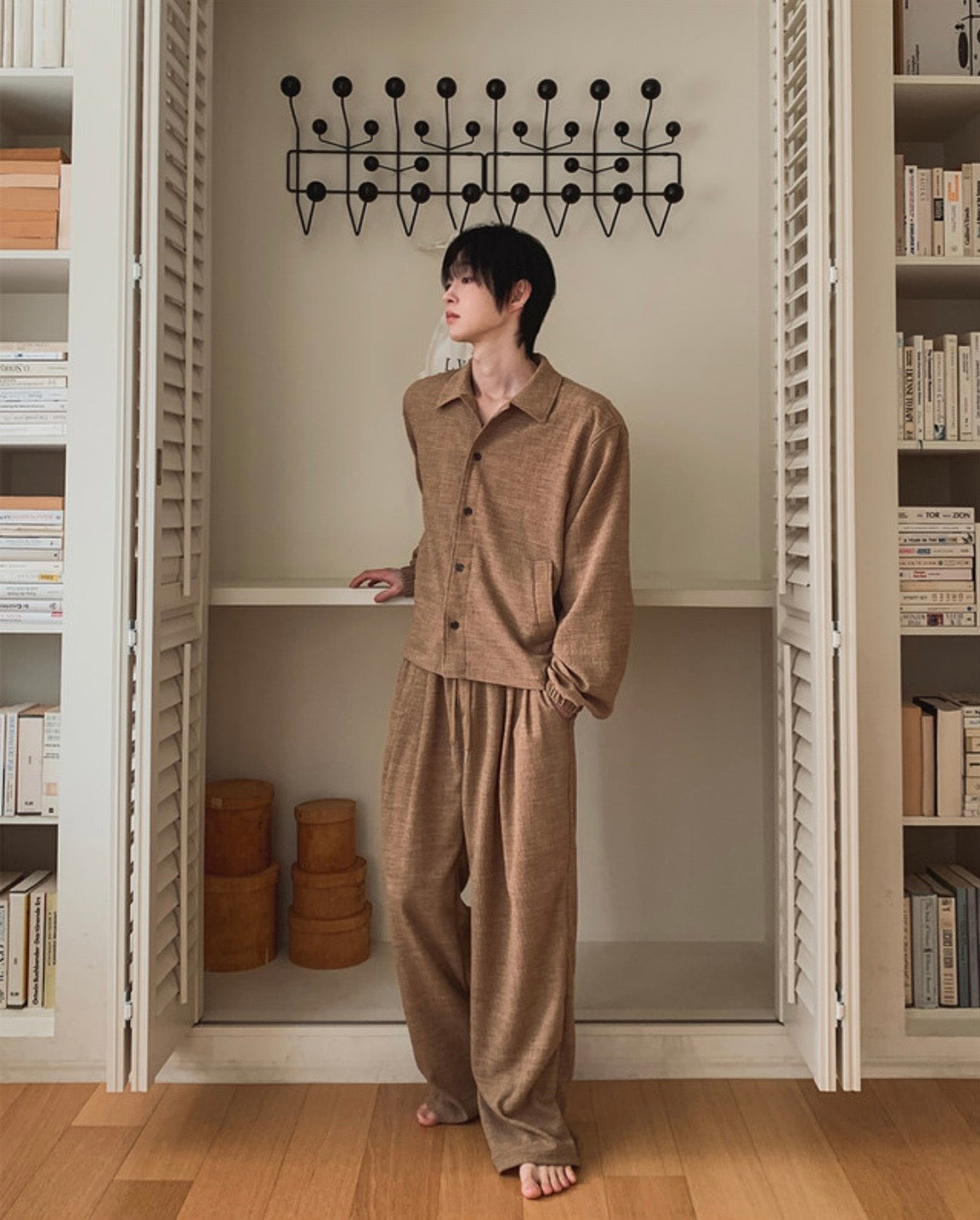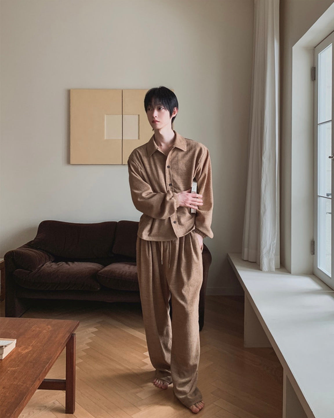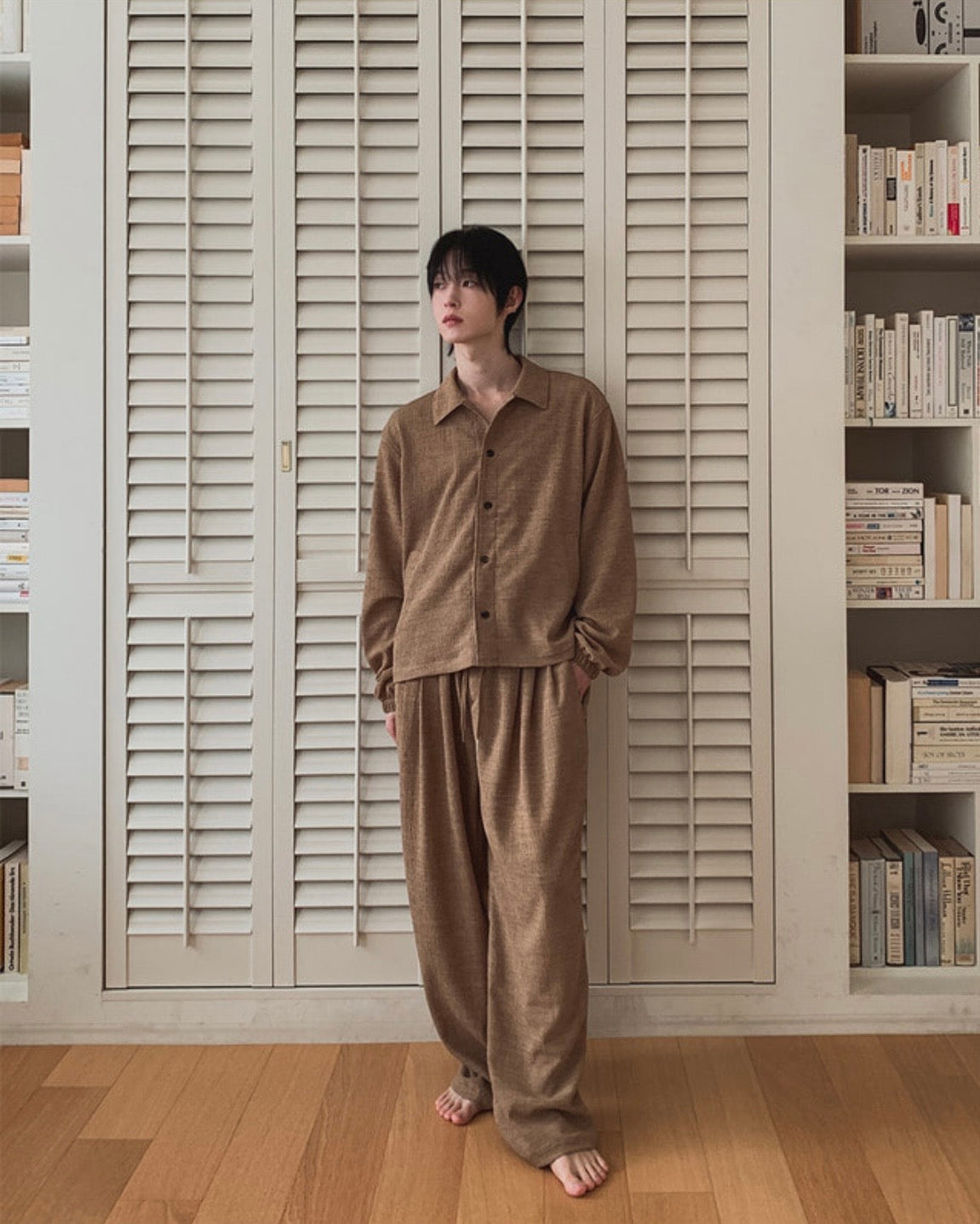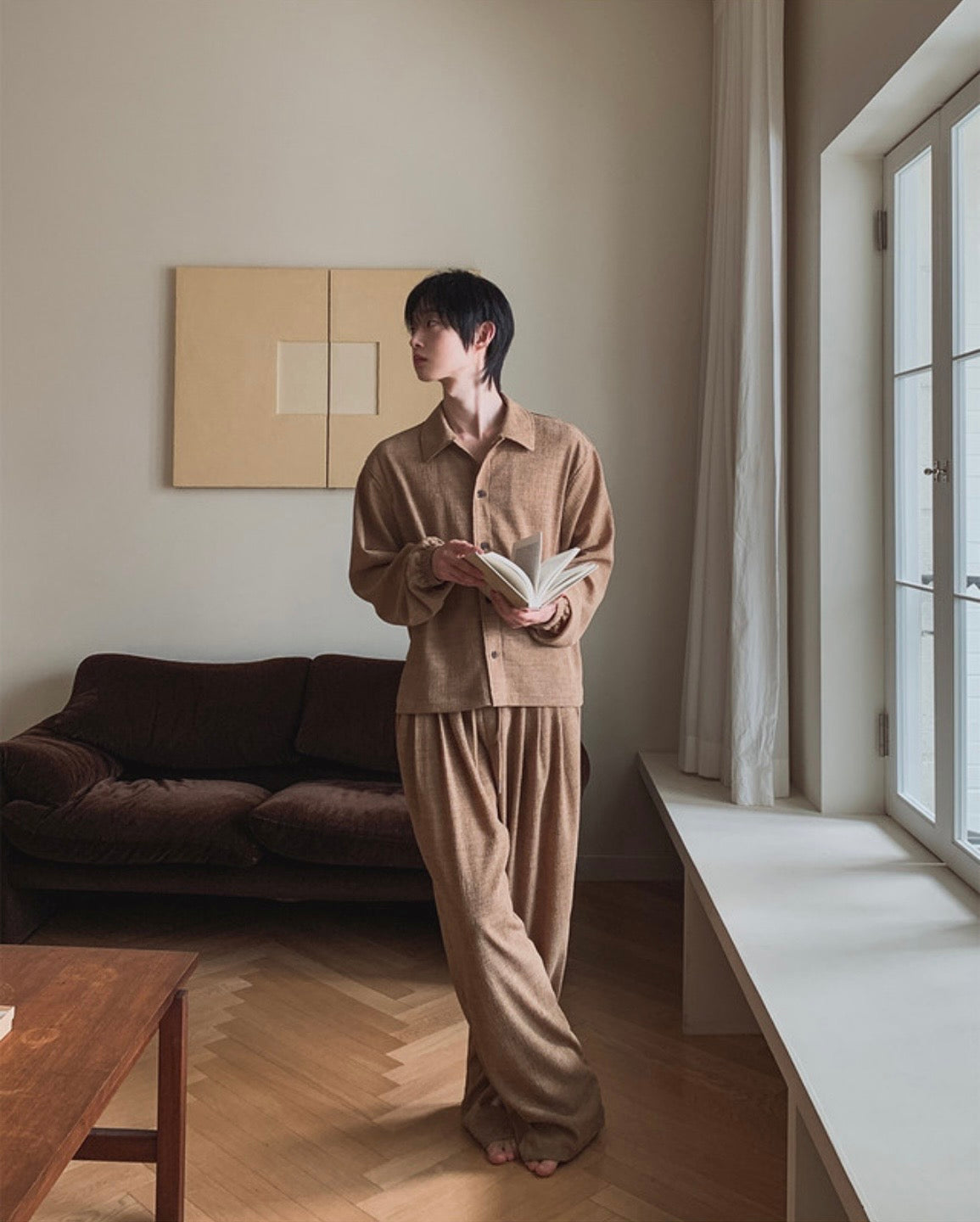 自然紋理面料,帶點立體肌理感,不貼身卻很有型,寬鬆版型搭配打摺設計,穿起來垂墜順,比例拉長,日常或居家都很舒服,腰頭鬆緊+抽繩設計,包容度高,不挑身形,是那種看起來很隨性但其實很有質感的一條褲子。