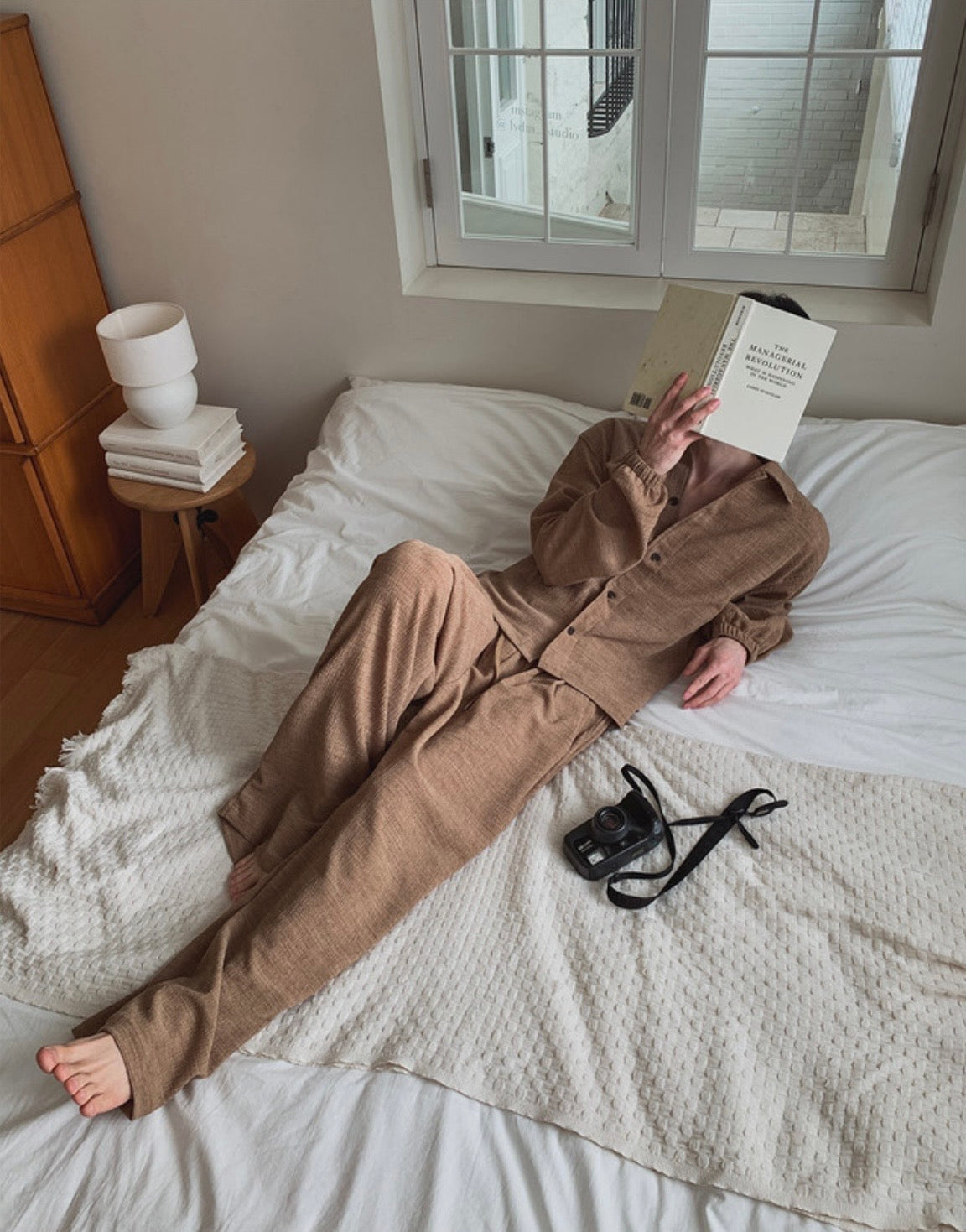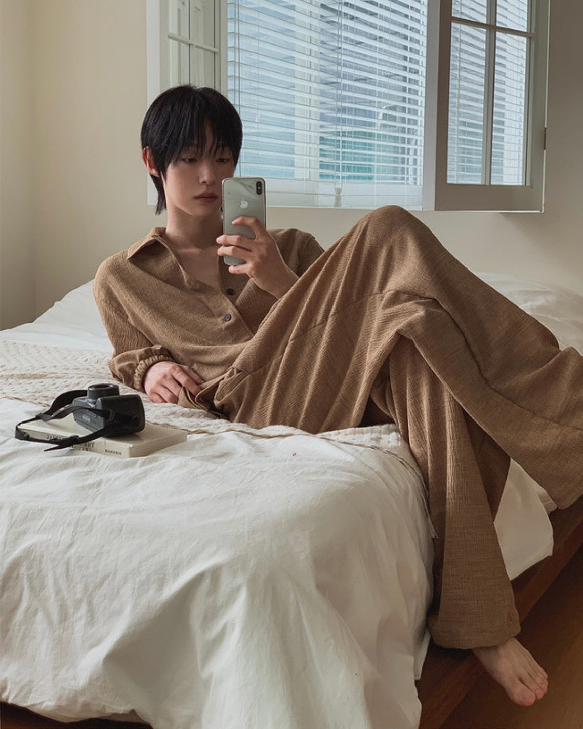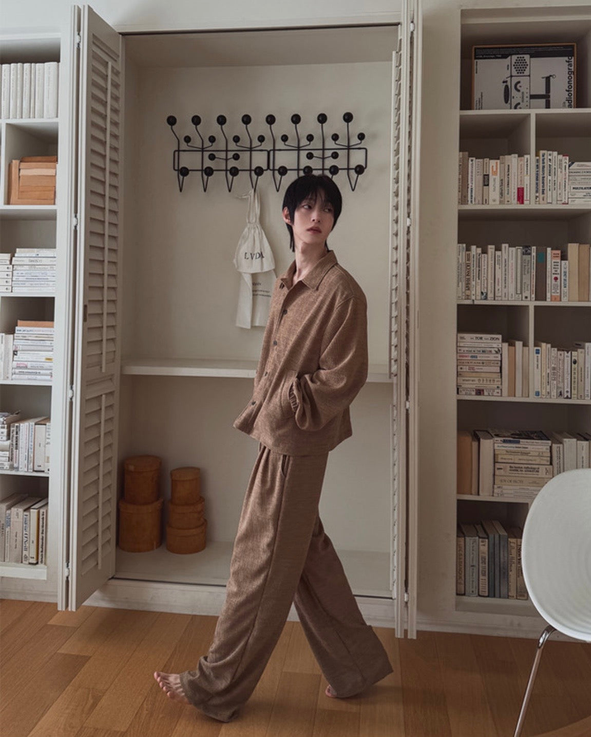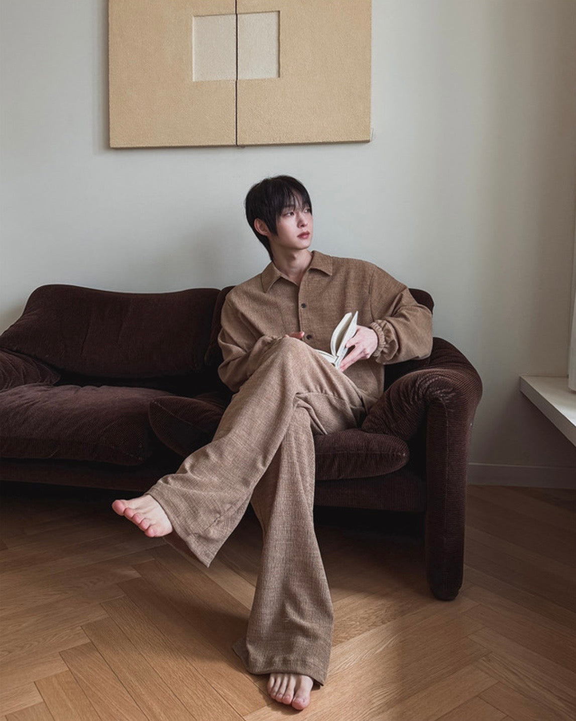 自然紋理面料,帶點立體肌理感,不貼身卻很有型,寬鬆版型搭配打摺設計,穿起來垂墜順,比例拉長,日常或居家都很舒服,腰頭鬆緊+抽繩設計,包容度高,不挑身形,是那種看起來很隨性但其實很有質感的一條褲子。