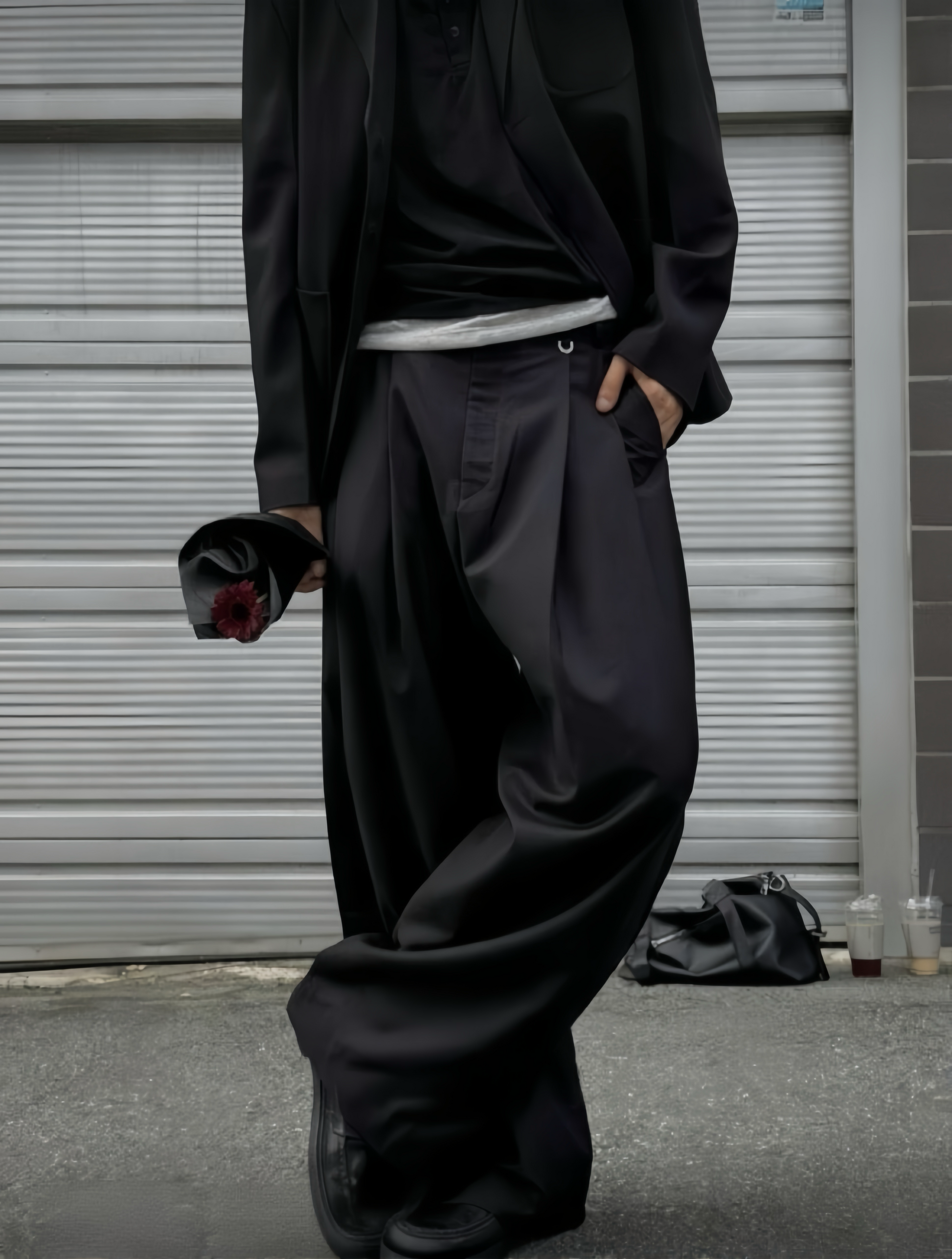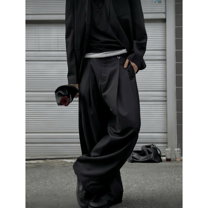 J76 垂墜雙褶寬褲 (黑 灰)