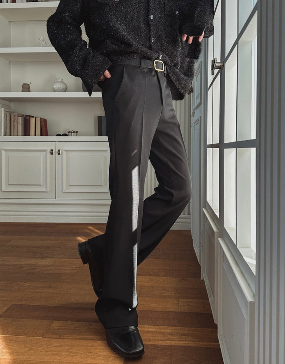 高腰喇叭版型,從腰線到褲腳一路順修,拉長腿部比例,站著就有線條感,布料挺,垂墜度好,走動時自然擺動,質感很乾淨,前打摺設計增加活動空間,久穿不卡腿,腰頭俐落,可搭皮帶,正式休閒都能配,褲腳微寬蓋鞋剛好,整體顯瘦又有份量感,日常與通勤都適合。