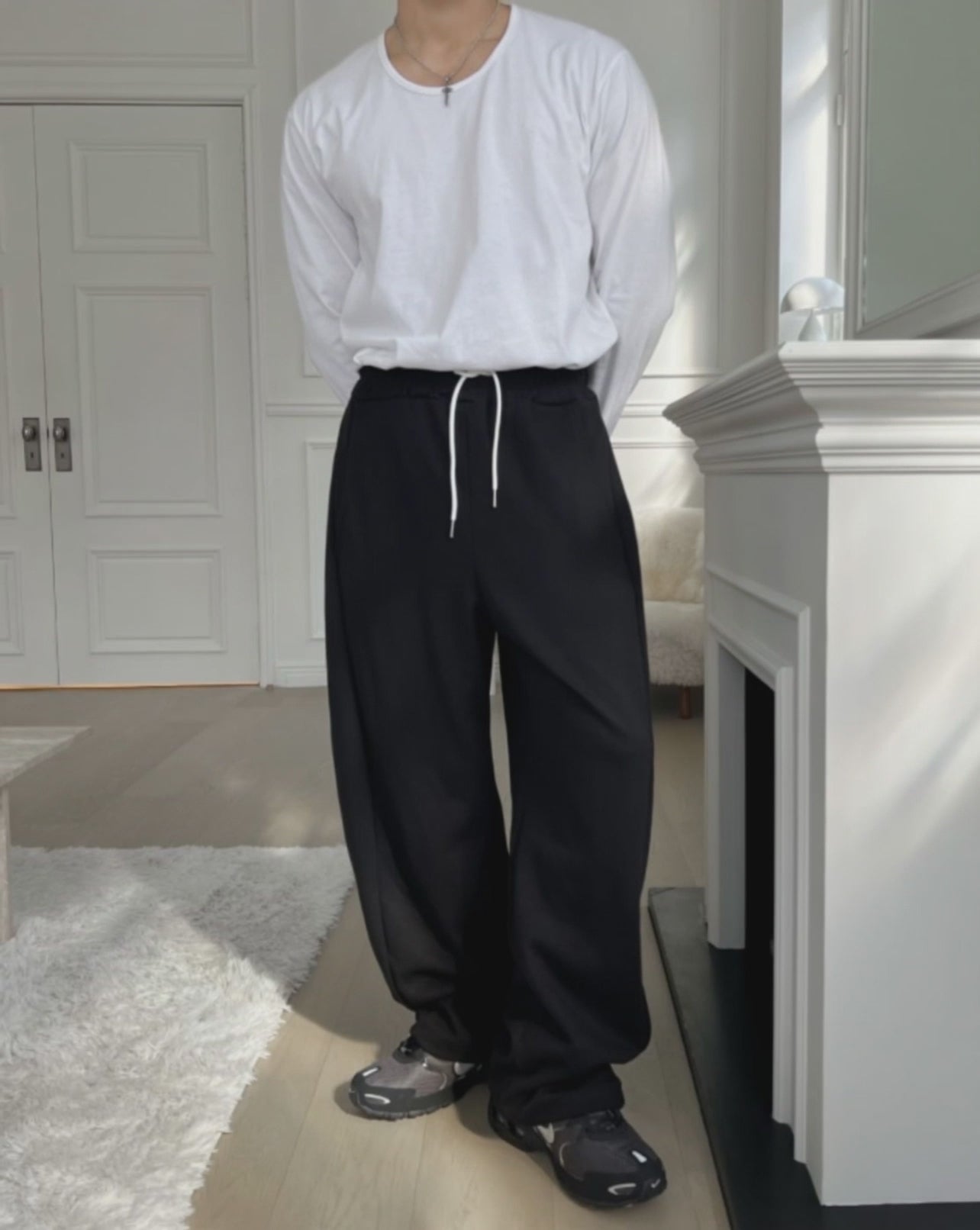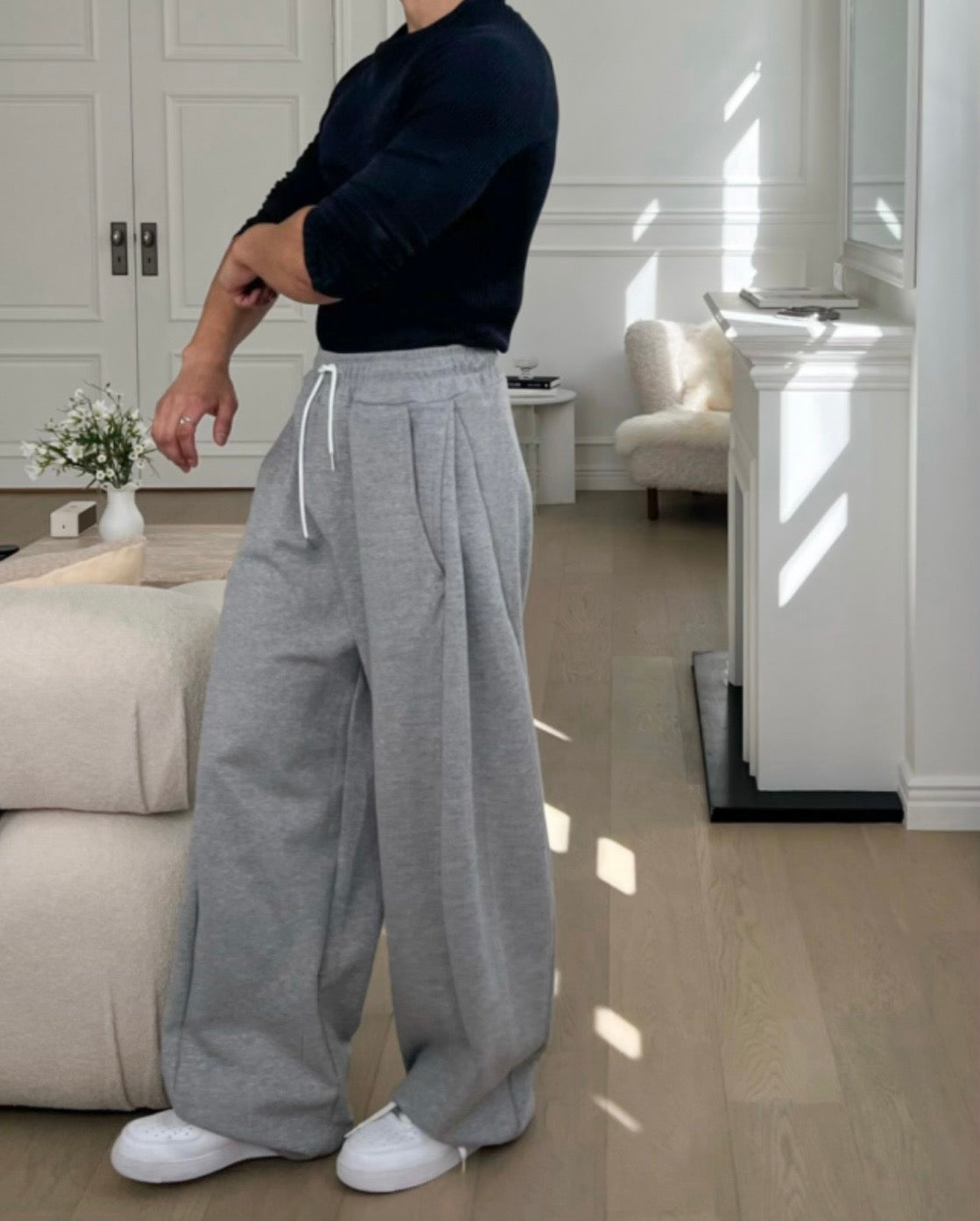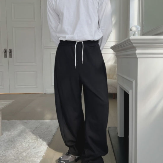 布料柔軟厚實,穿起來舒適不悶,鬆緊腰頭搭配抽繩設計,活動自在又好調整,側邊打摺讓褲型更立體,落地寬直筒線條自然修飾腿型,灰白黑三色都很好搭,配T恤或襯衫都能呈現乾淨俐落的日常感,是衣櫃裡很實穿的一條。